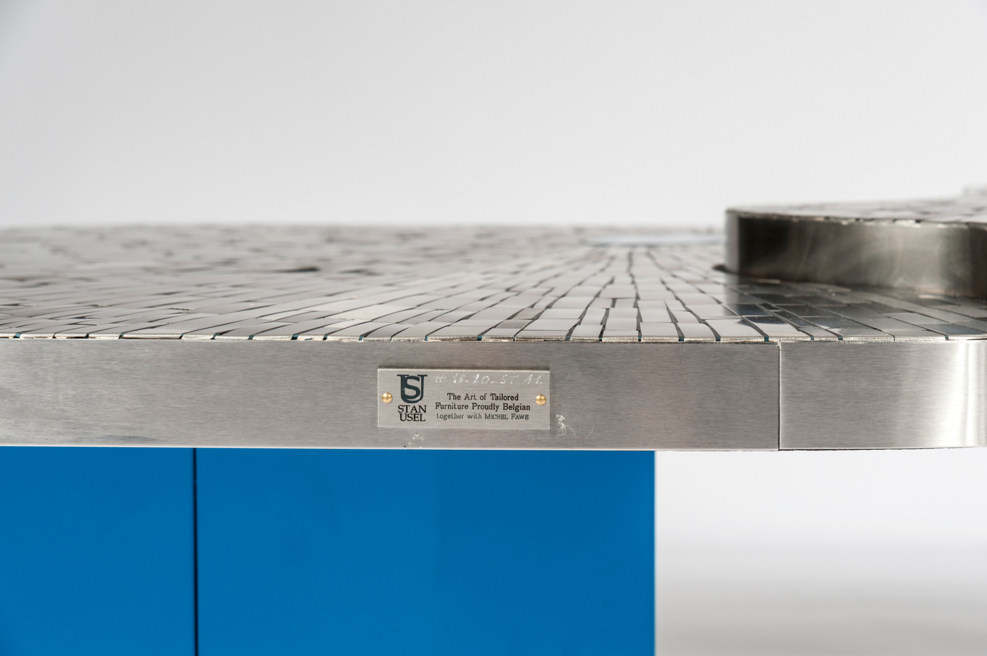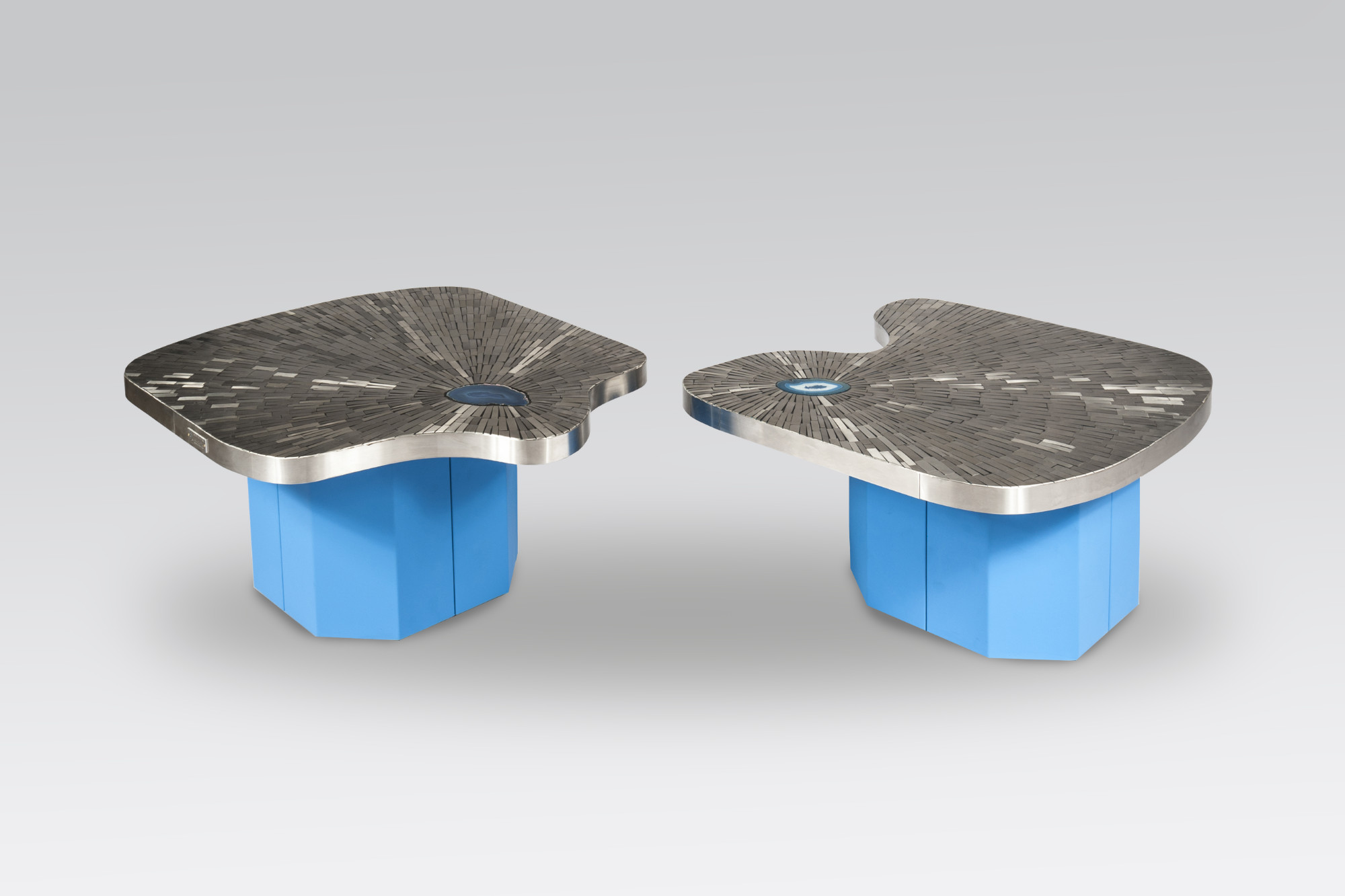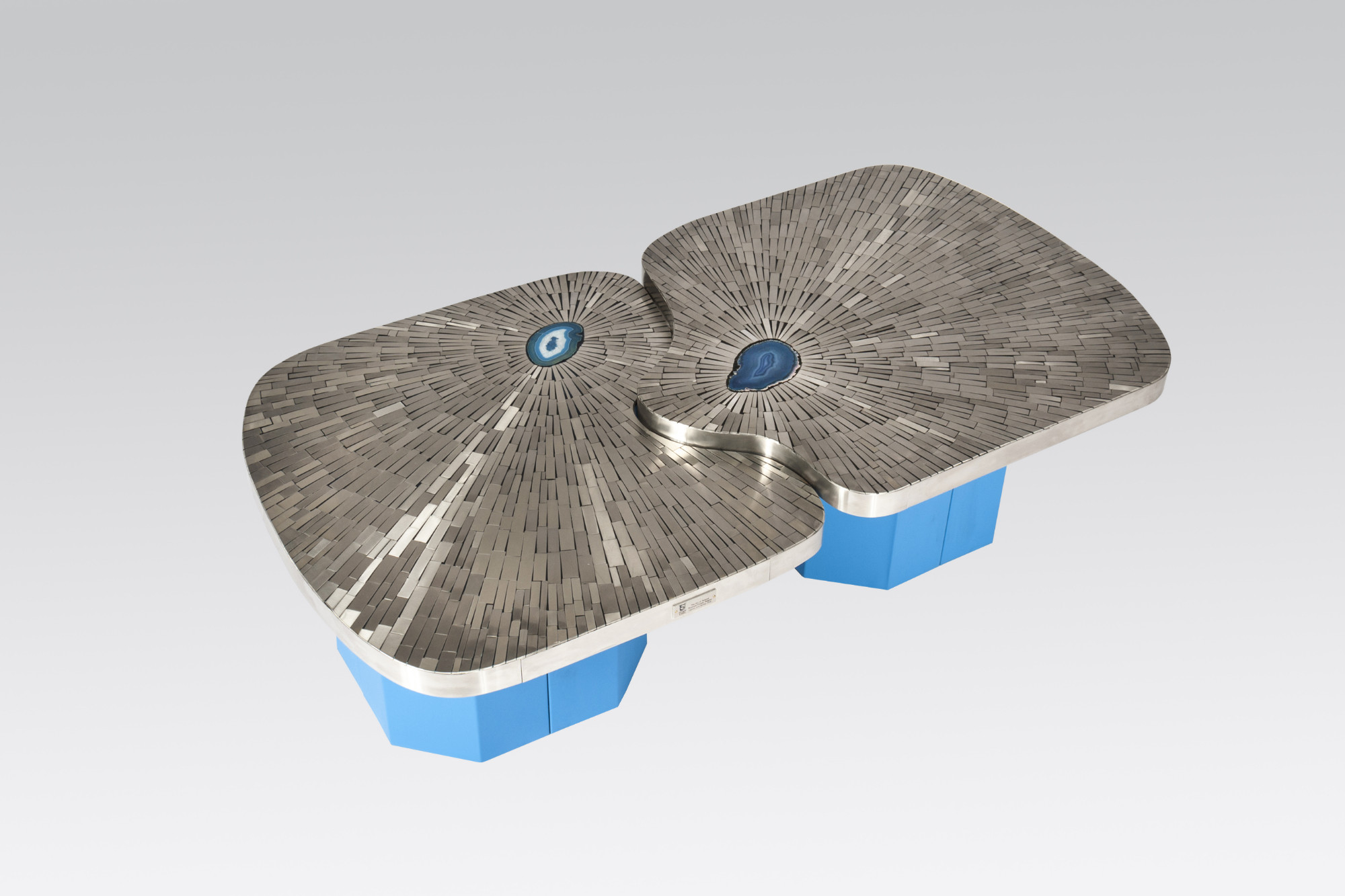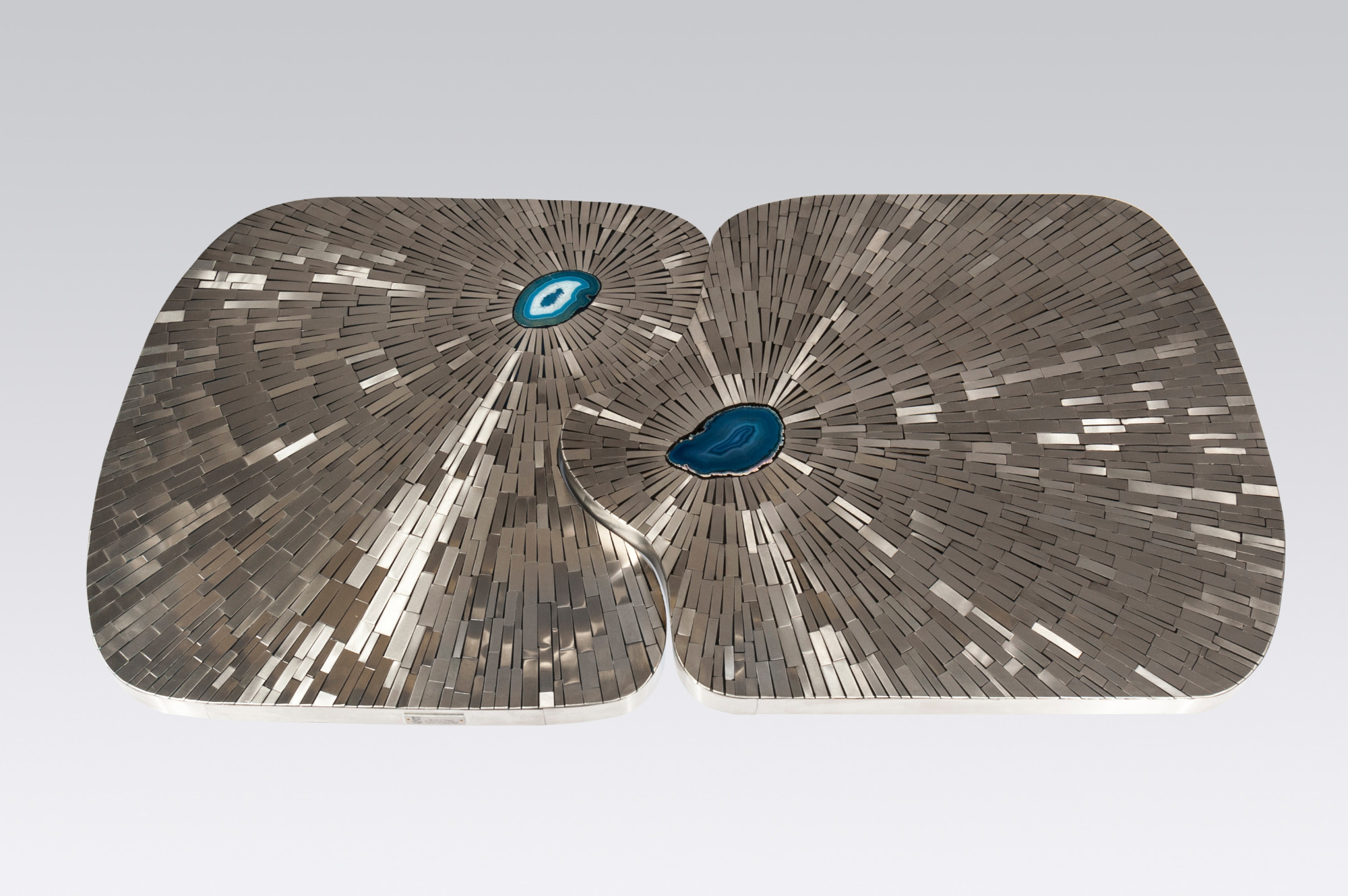 Created to measure by Stan Usel, this 2 in 1 coffee table and side table in mosaic stainless steel and blue agates gemstone. Do not hesitate to ask us the different models, already executed. Form Exceptional craftsmanship with the art of tailor made furniture. This original and unique pieces are signed by the artist and comes with the certificate of authenticity.All pieces can be custom-made to order. Proudly Belgian.