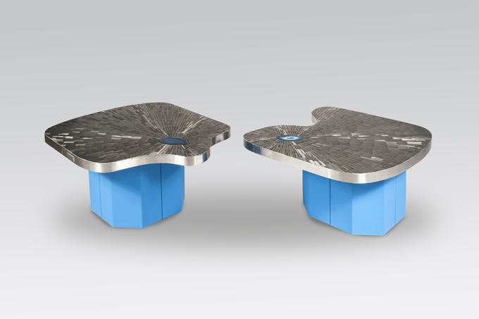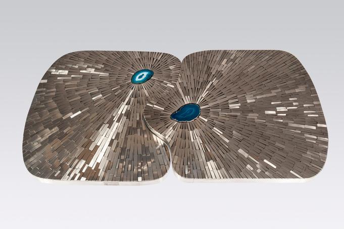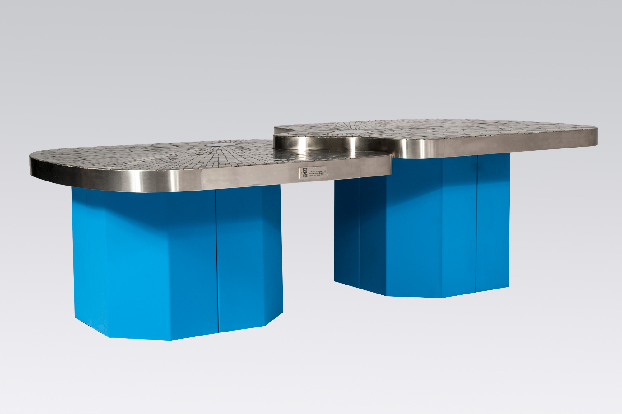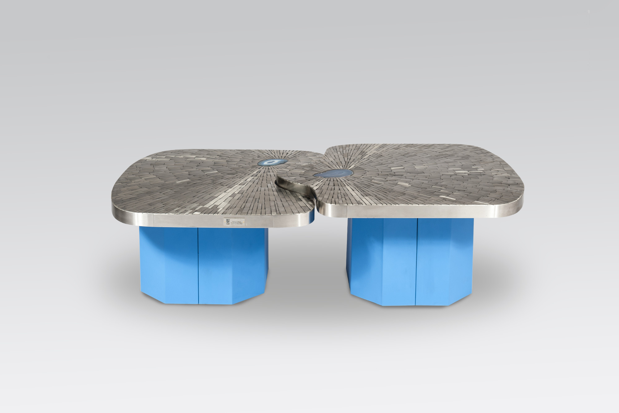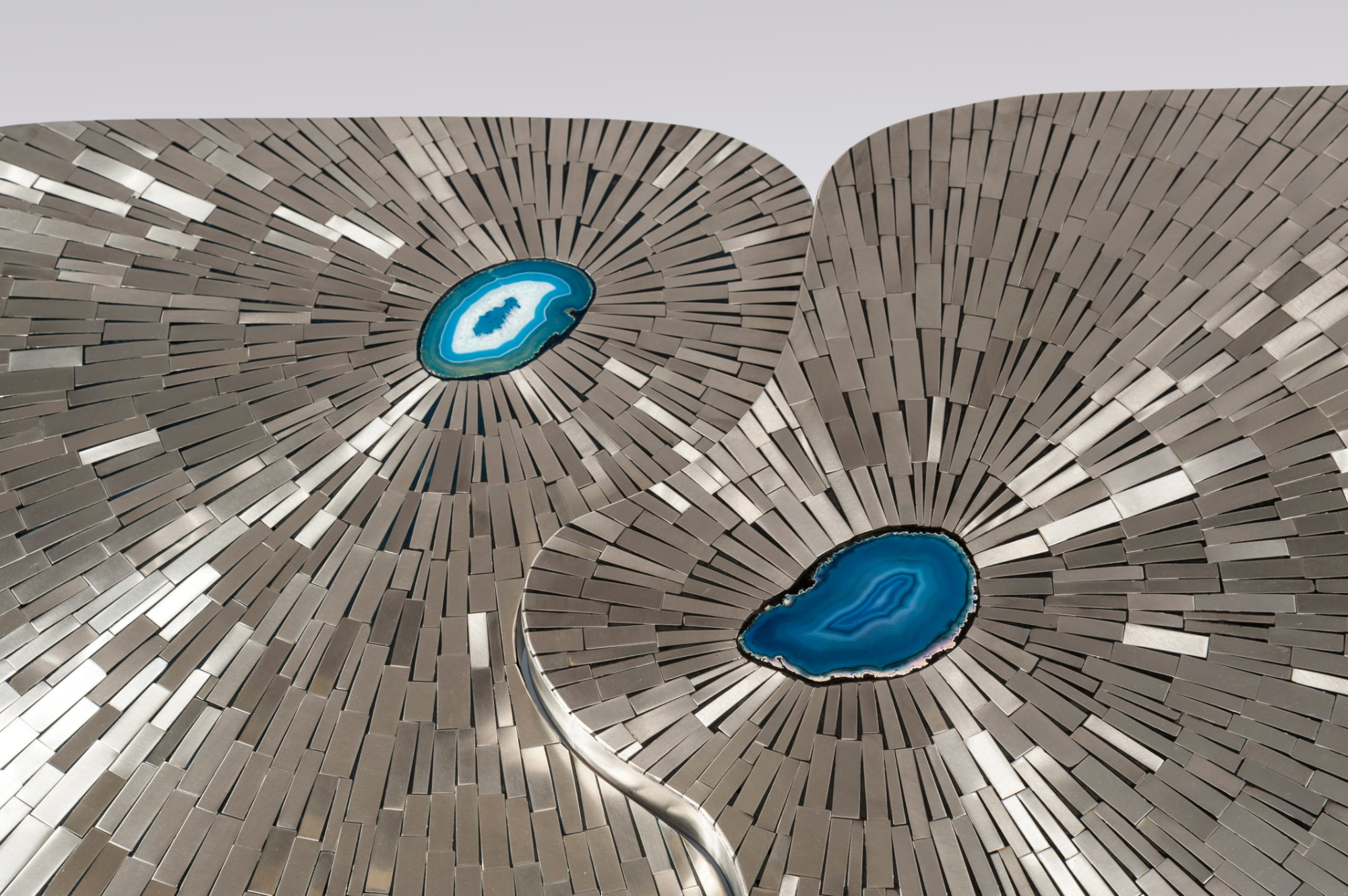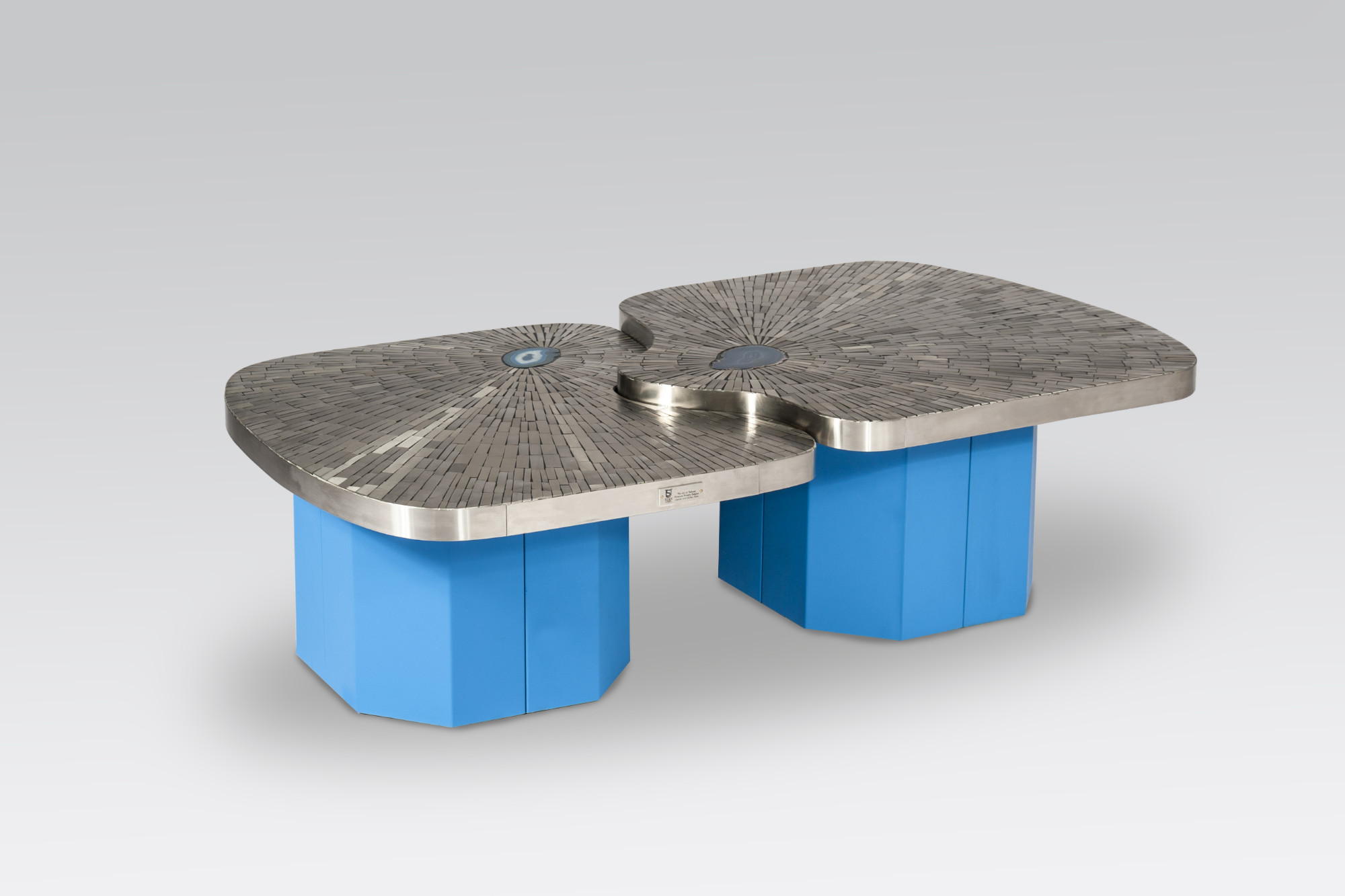Created to measure by Stan Usel, this 2 in 1 coffee table and side table in mosaic stainless steel and blue agates gemstone. Do not hesitate to ask us the different models, already executed. Form Exceptional craftsmanship with the art of tailor made furniture. This original and unique pieces are signed by the artist and comes with the certificate of authenticity.All pieces can be custom-made to order. Proudly Belgian.