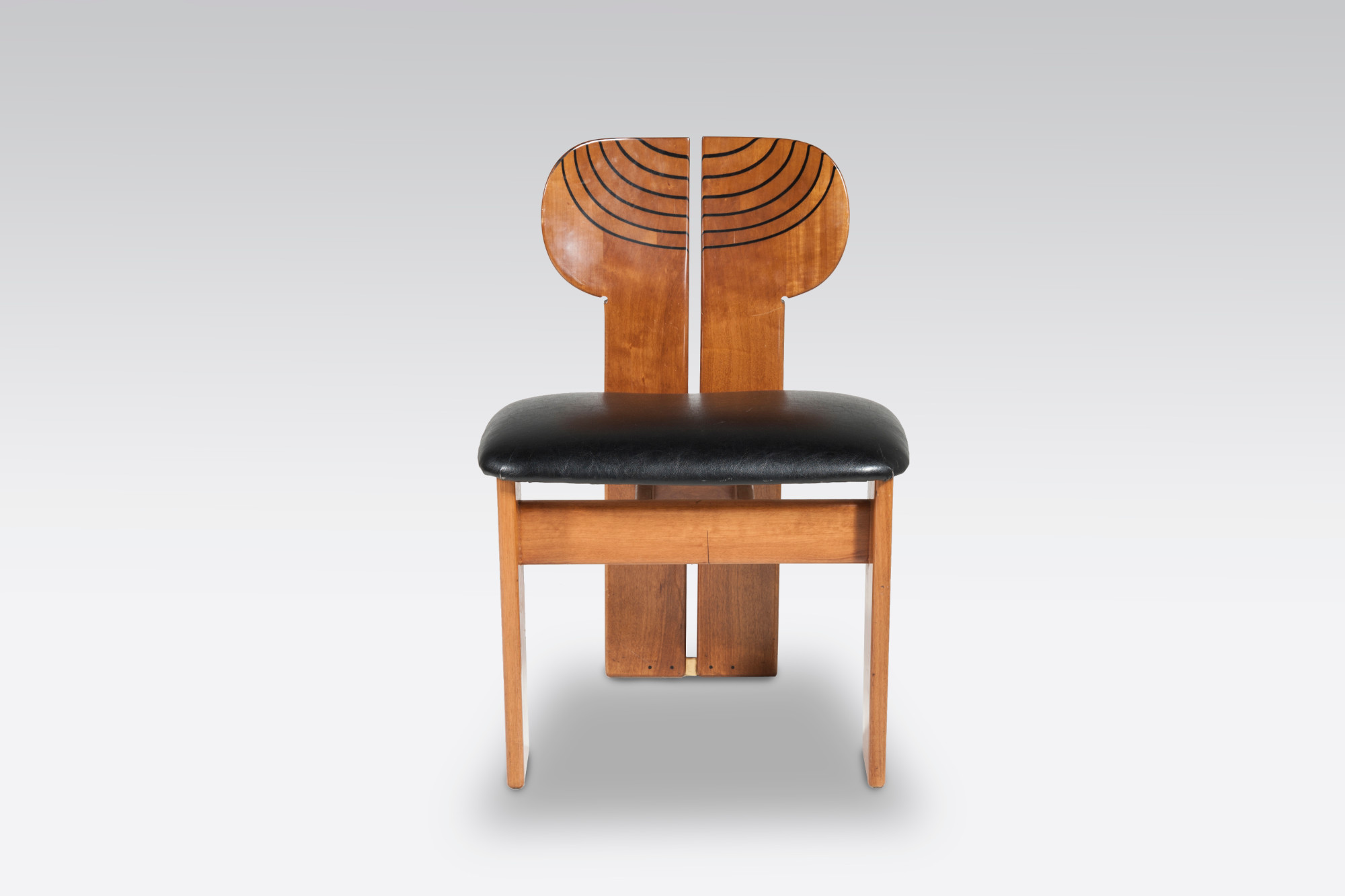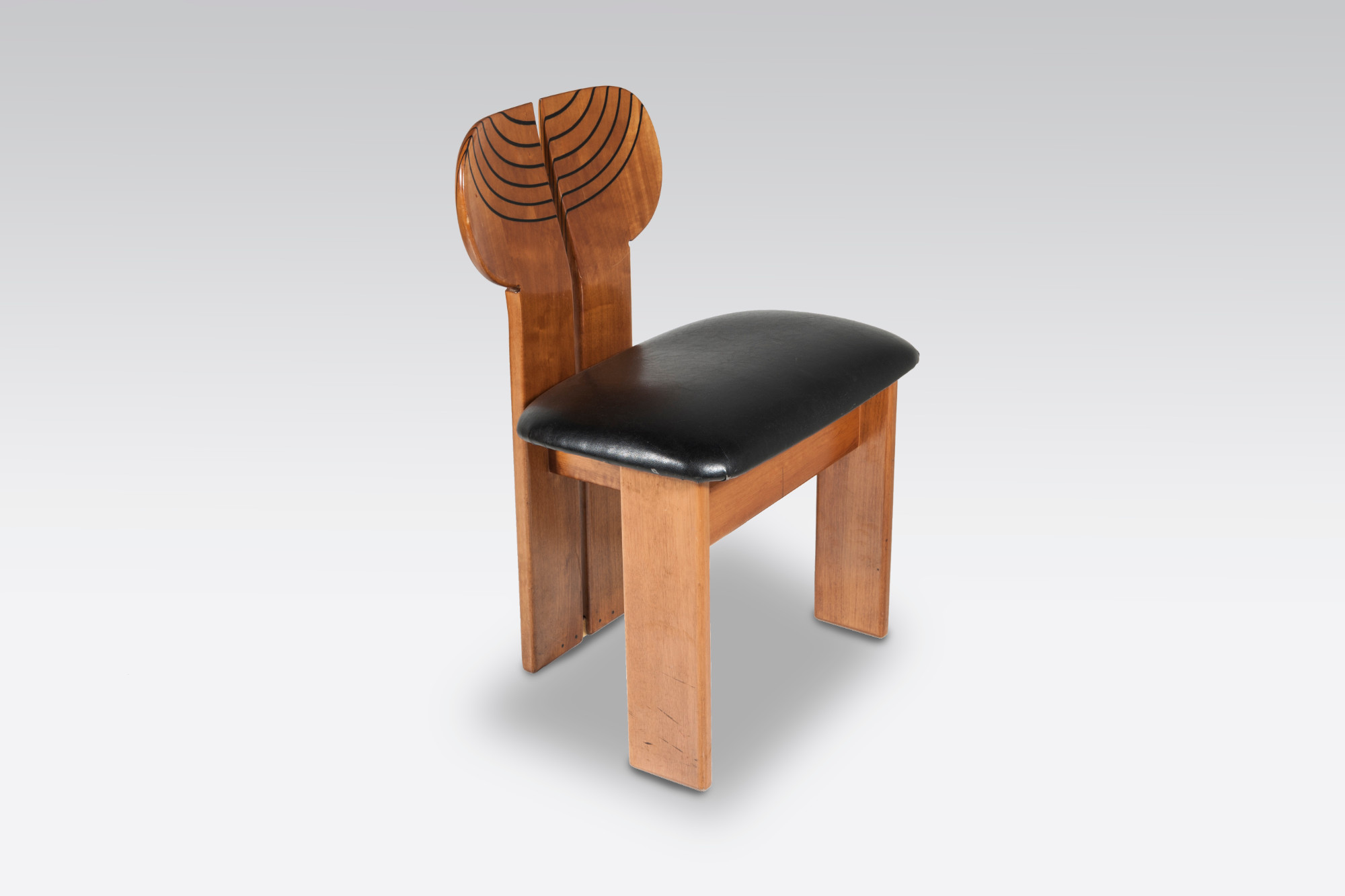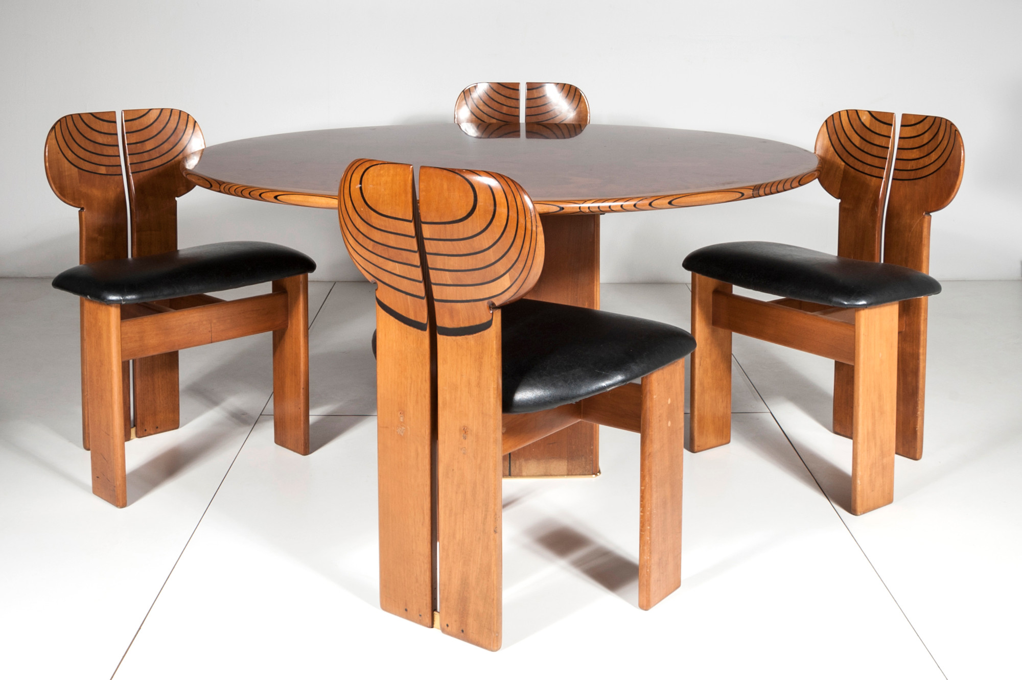 Produced by Maxalto Italia, the Africa series, a set of four of Africa dining/side chairs, and a circular table, designed by Afra and Tobia Scarpa in 1975. Beautifully handmade out of walnut and ebony with brass parts, black leather seat