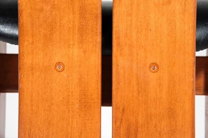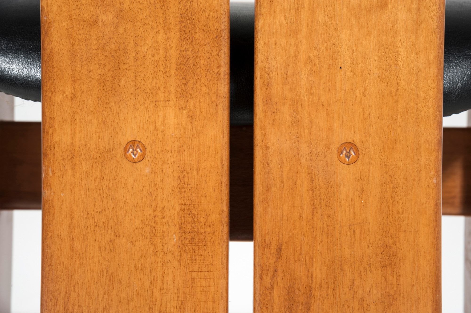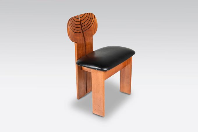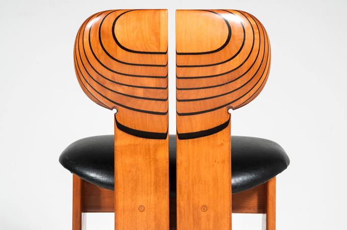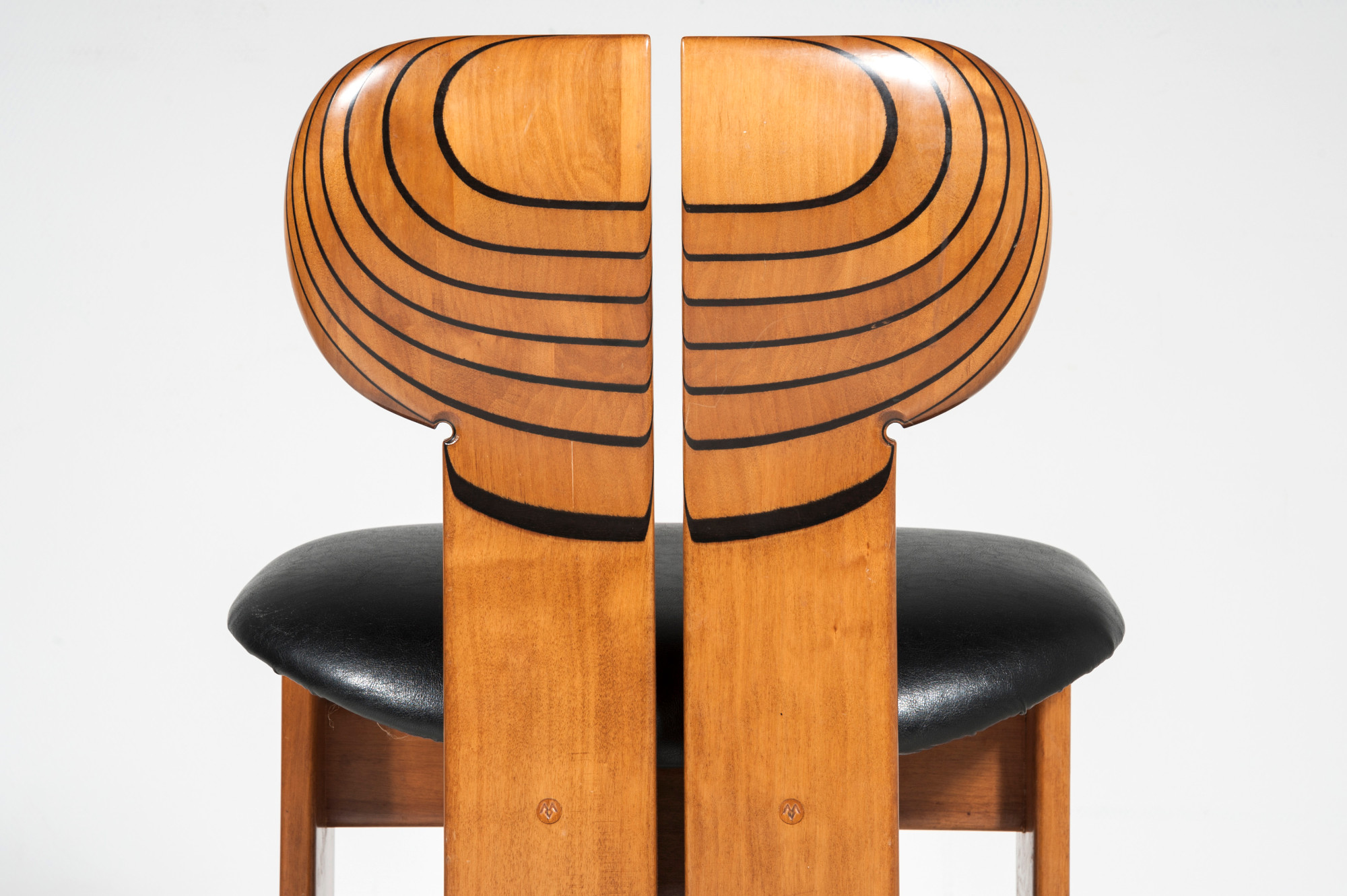 Produced by Maxalto Italia, the Africa series, a set of four of Africa dining/side chairs, and a circular table, designed by Afra and Tobia Scarpa in 1975. Beautifully handmade out of walnut and ebony with brass parts, black leather seat