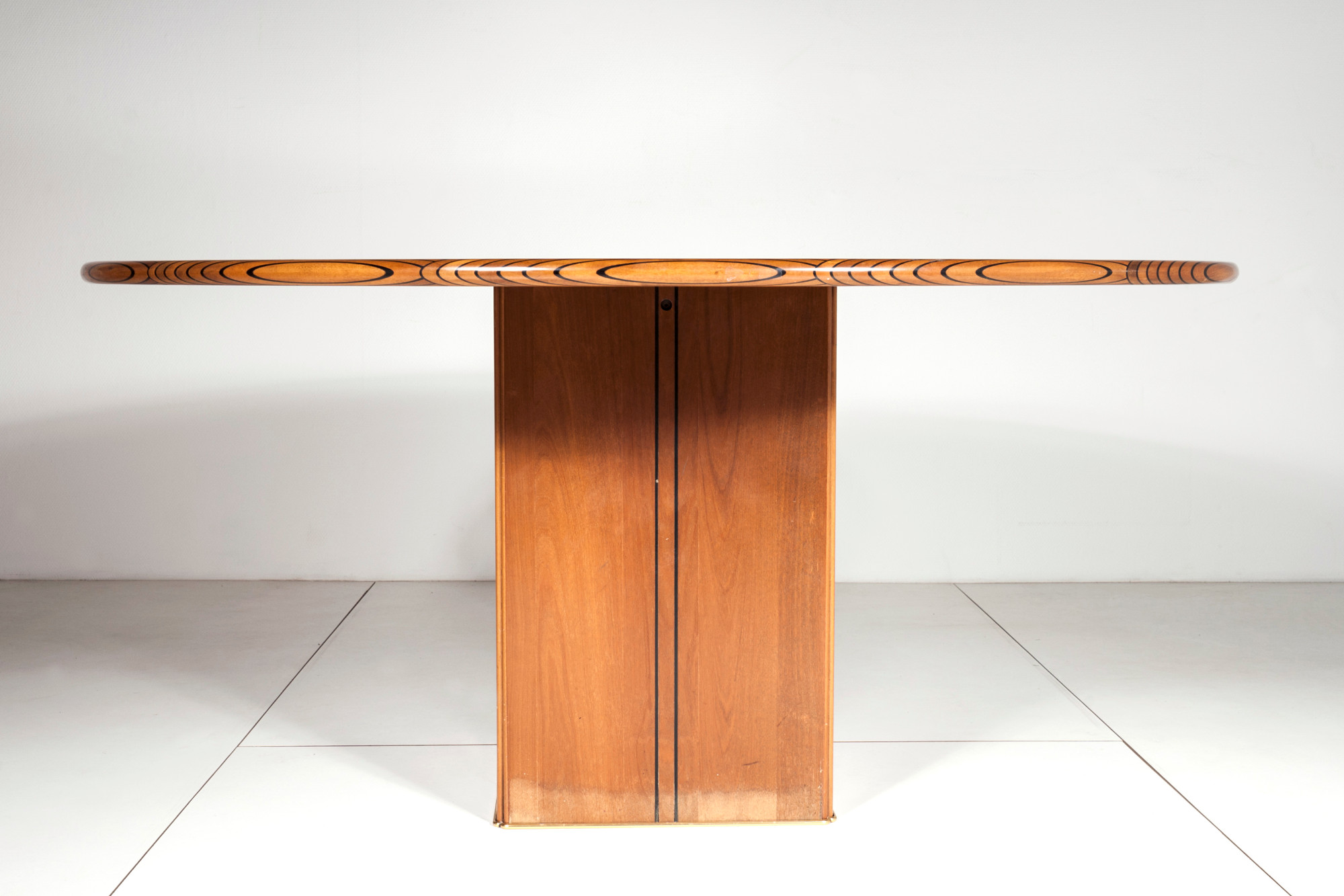 Maxalto is the luxury line of B&B Italia An oval shaped table with insert burl top and outer band with contrasting inlay of ebony and light walnut. Material burl wood, ebony, walnut.