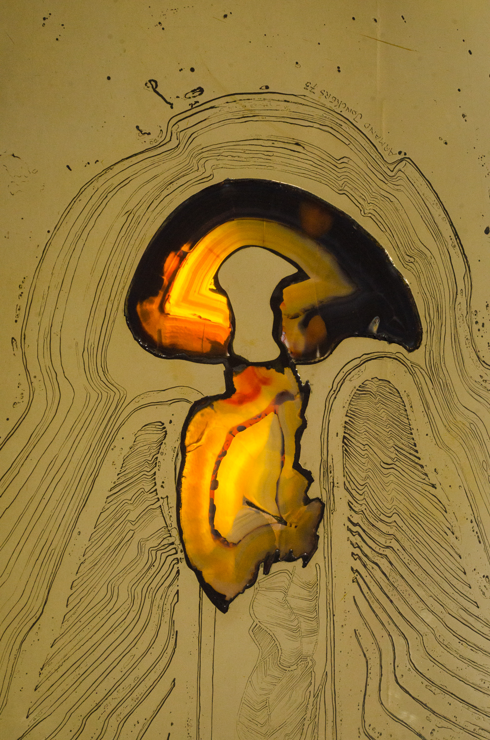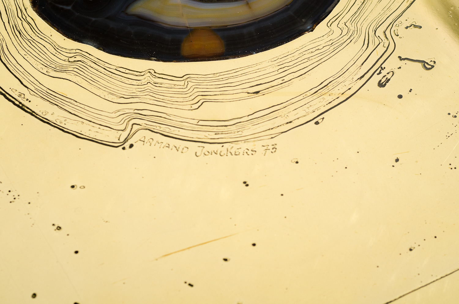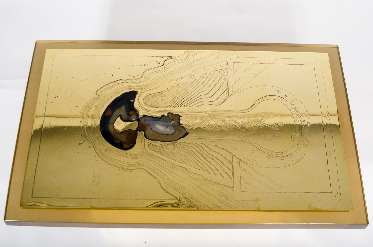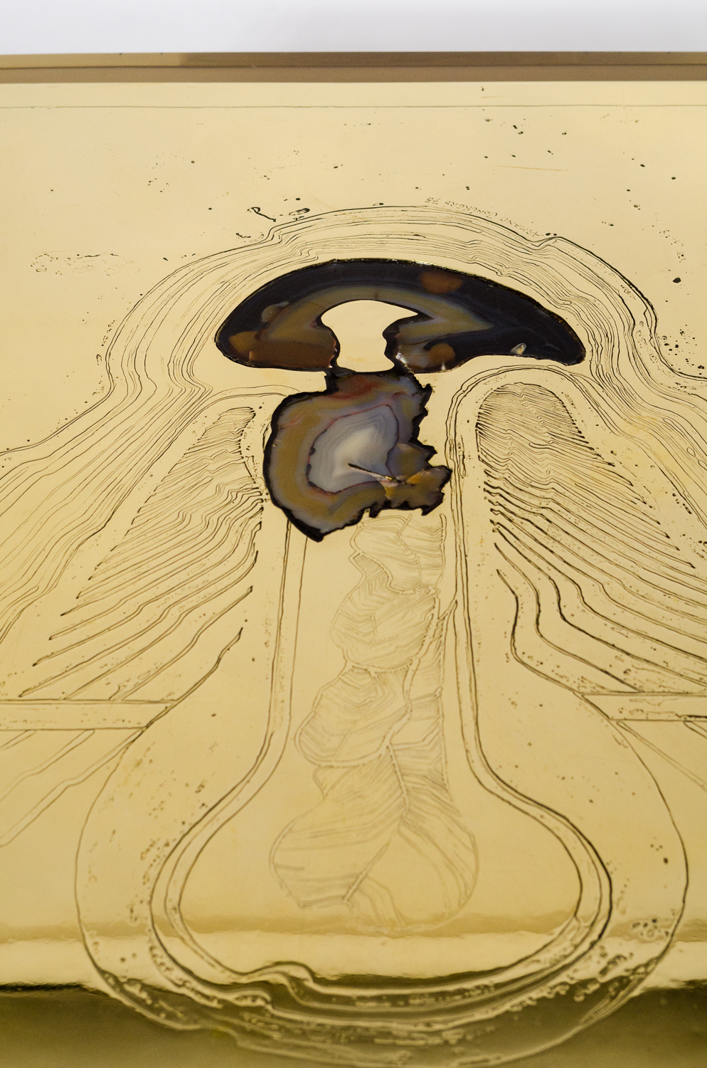 Engraved etched brass coffee table designed by Armand Jonckers in 1973, with a resin surrounding an agate stone top. The table stand is also etched with acid representing deep sea waves. This furniture has been fully restored at the Jonkers workshop