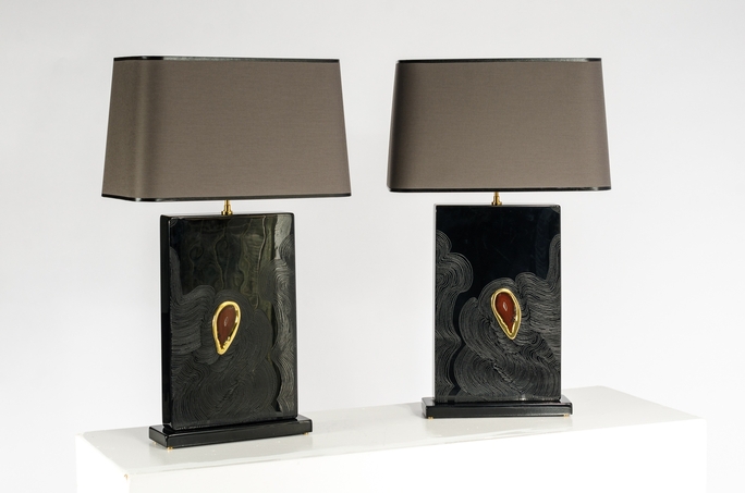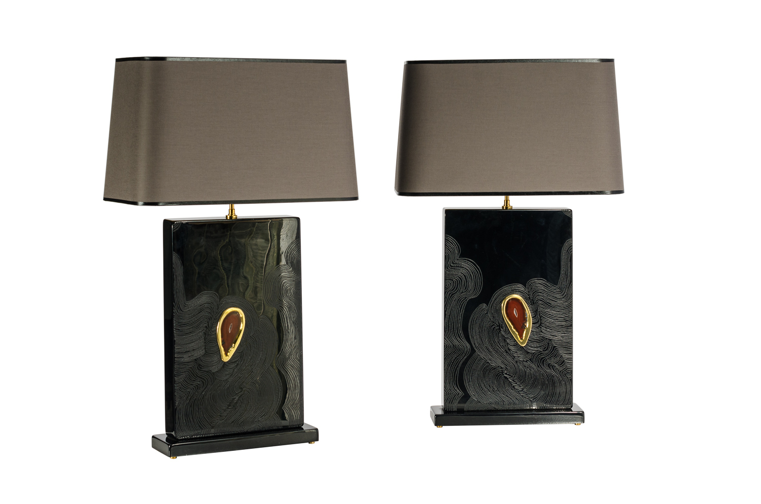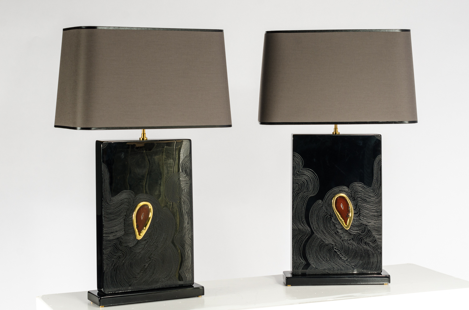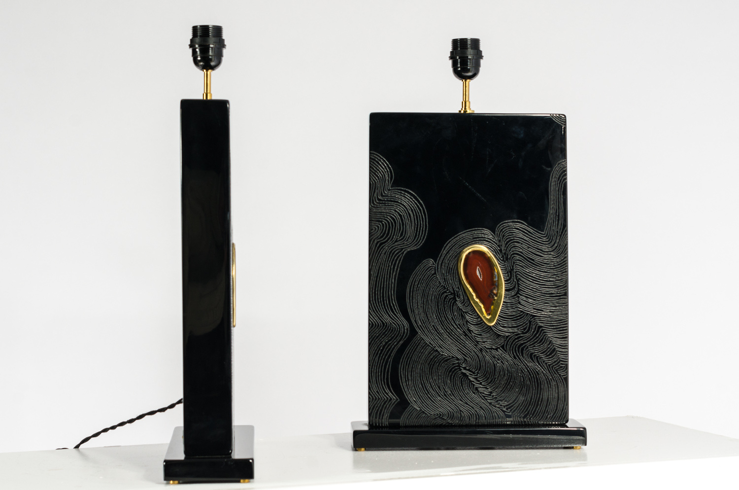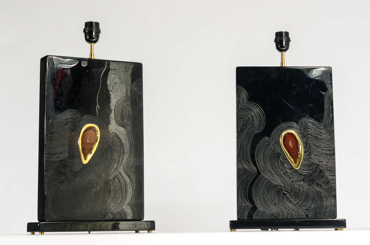 Pair Of Black Resin Table Lamps inlay Agate by Stan Usel