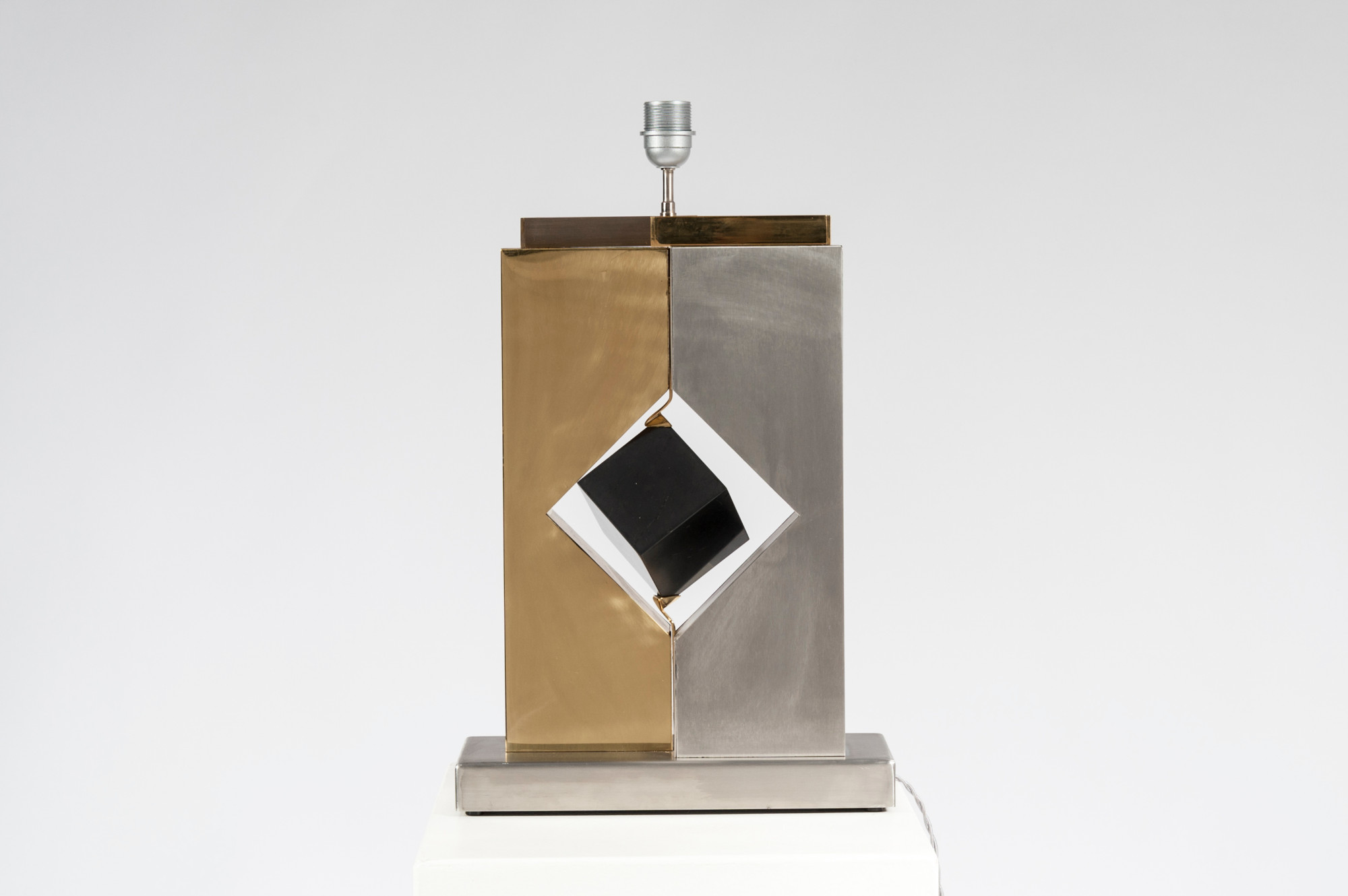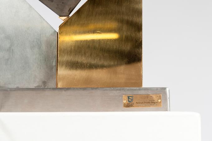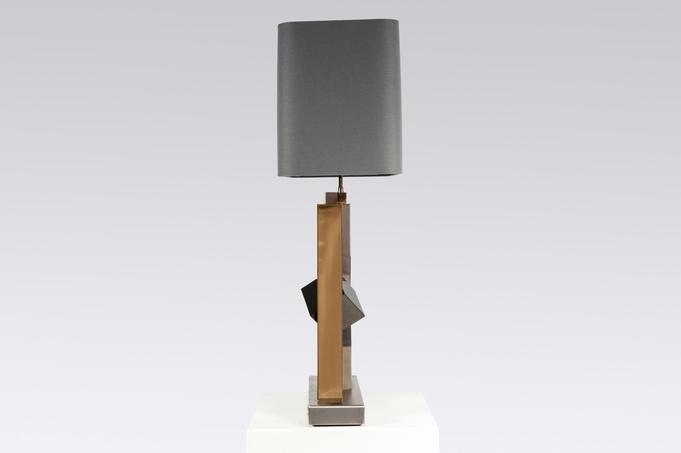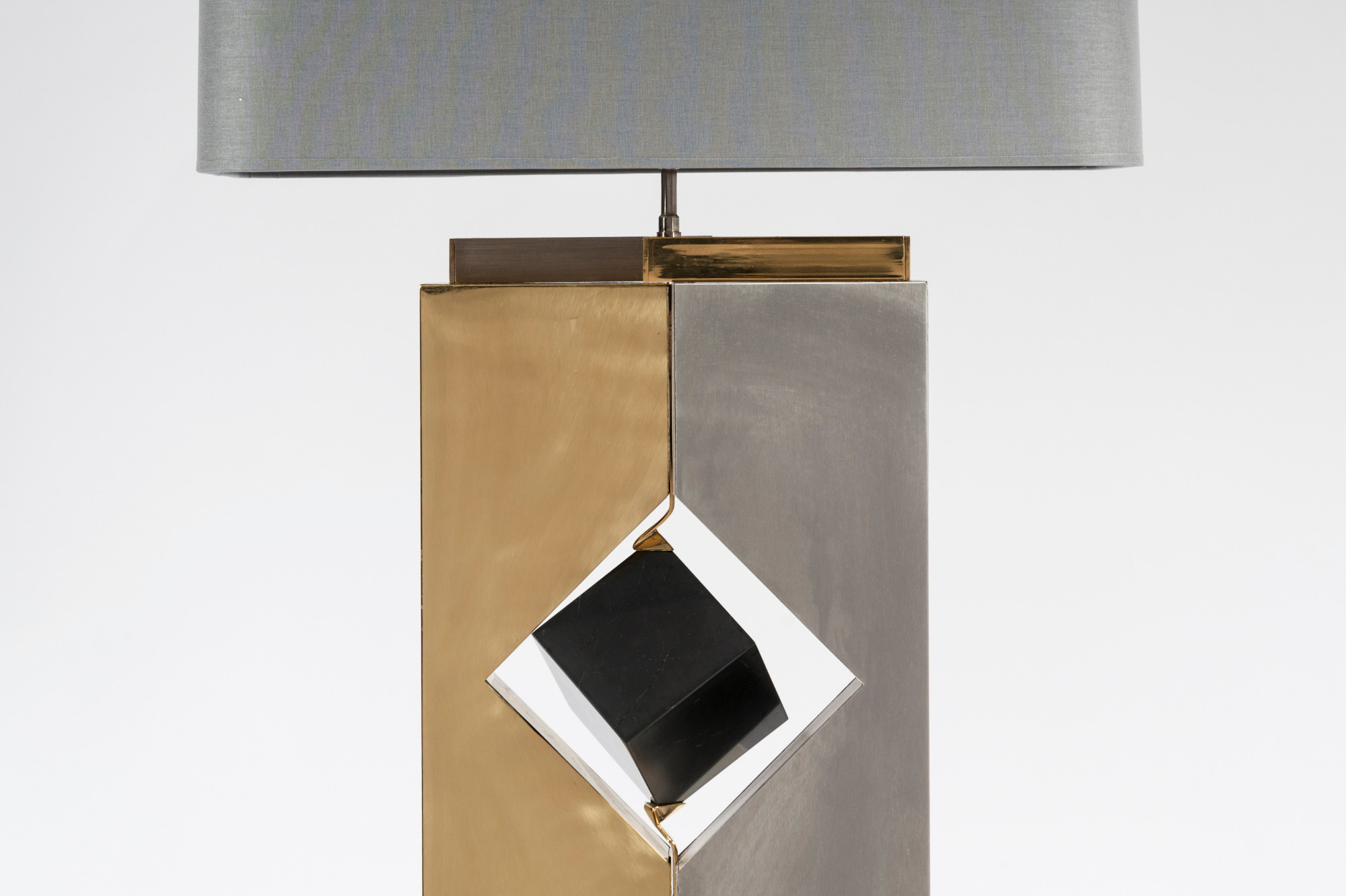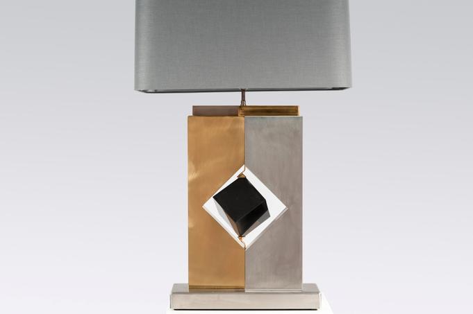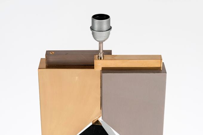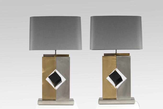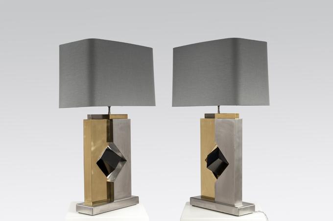 Created to measure by Stan Usel, this pair detail of Black marble cube,stainless steel and brass table lamps. Each piece is inlay with a unique stone and when put together aside gives a great sense of harmony. Exceptional craftsmanship with the art of tailor made furniture. This original and unique pieces are signed by the artist and comes with the certificate of authenticity.All pieces can be custom-made to order. Proudly Belgian.