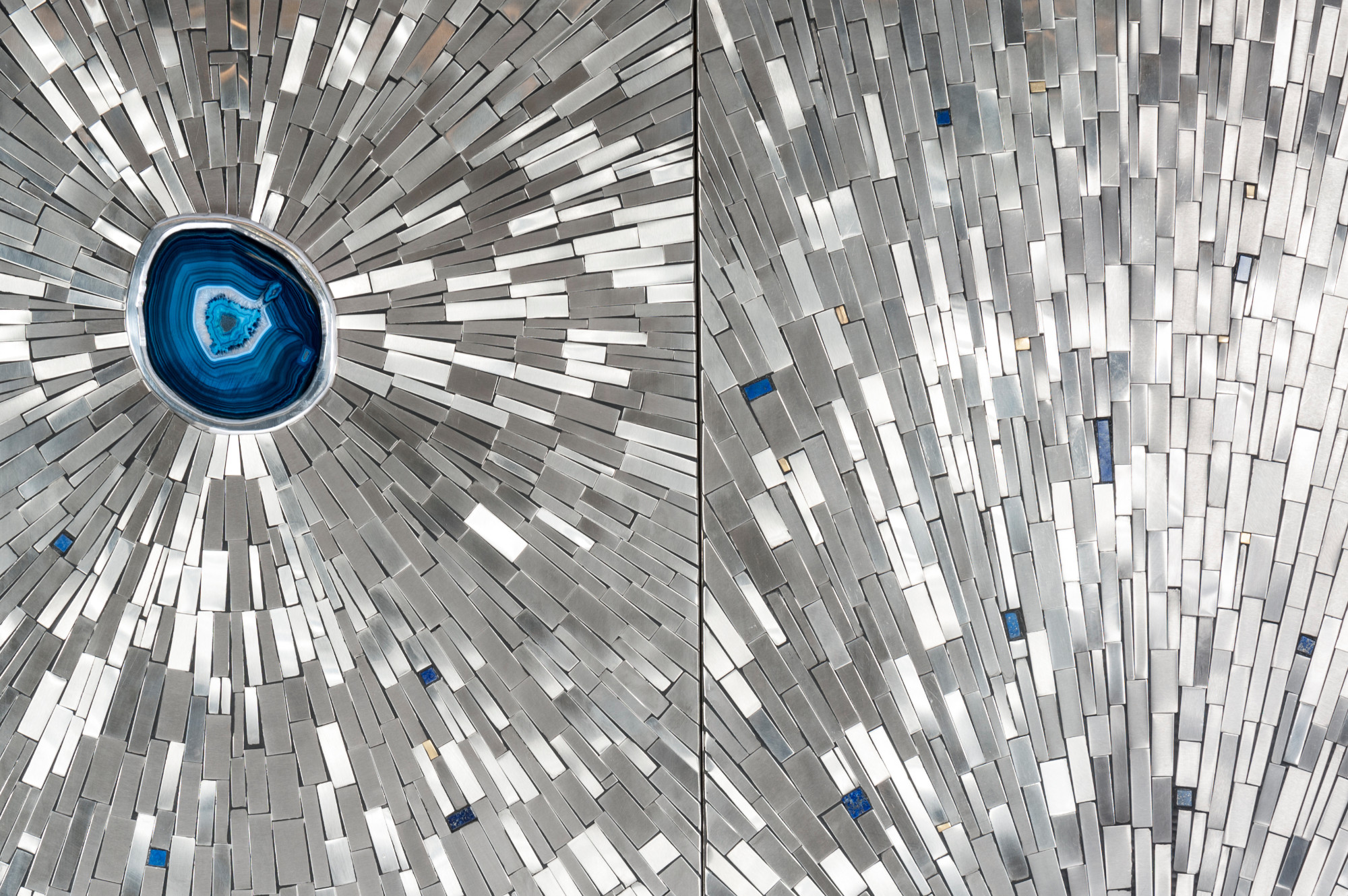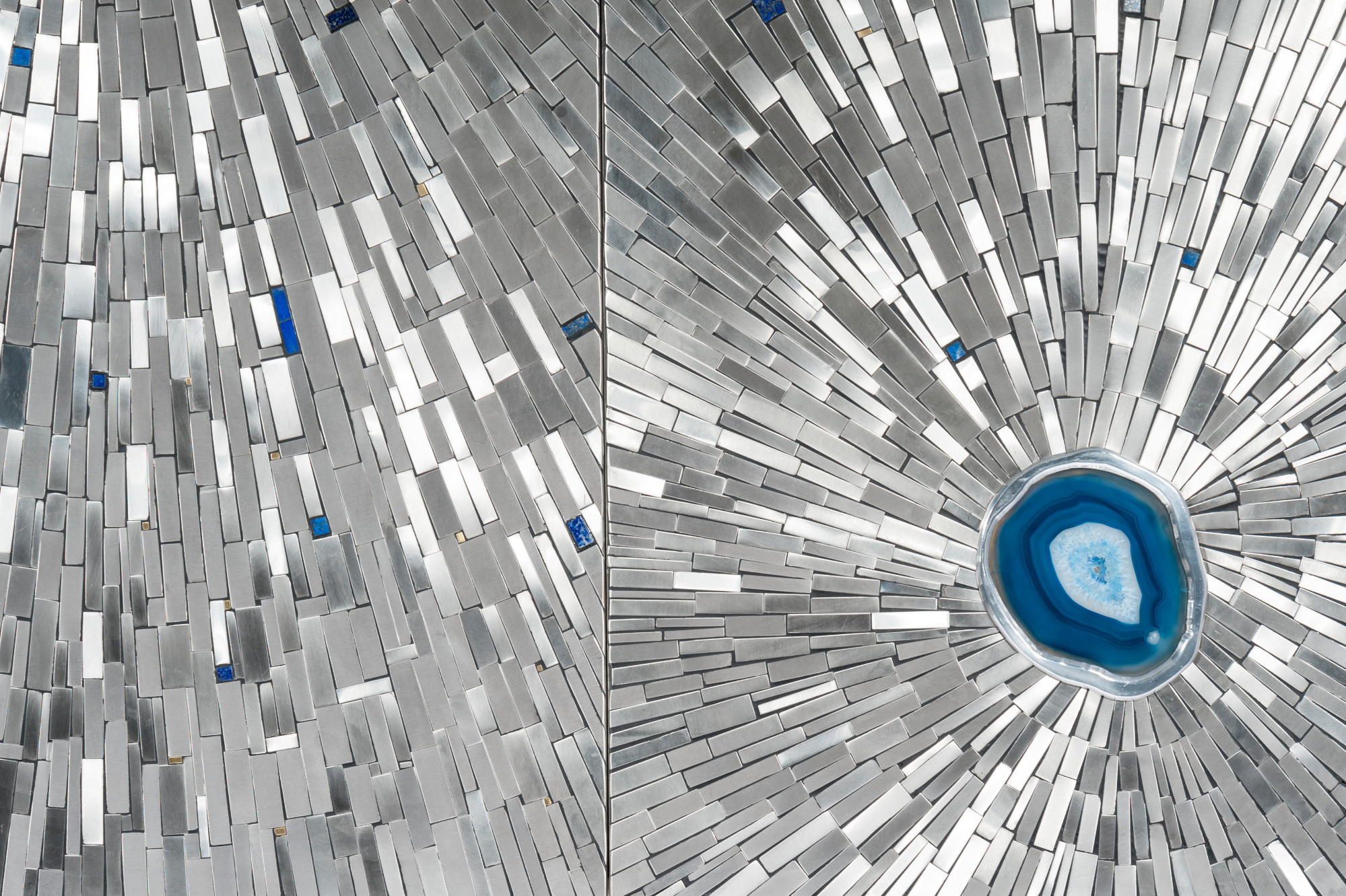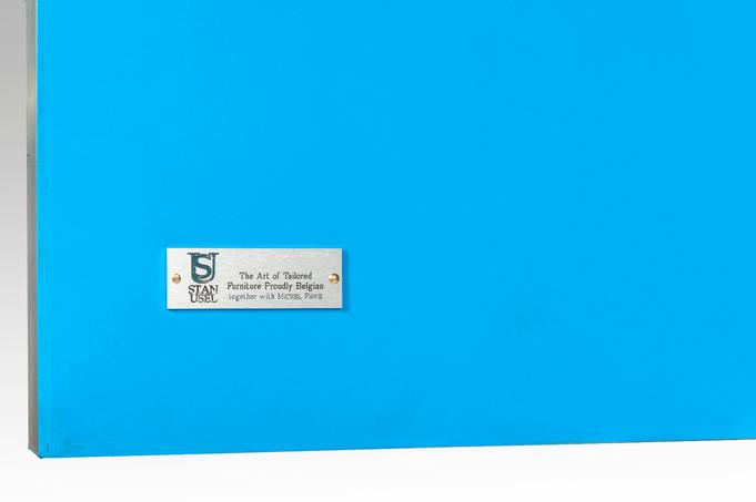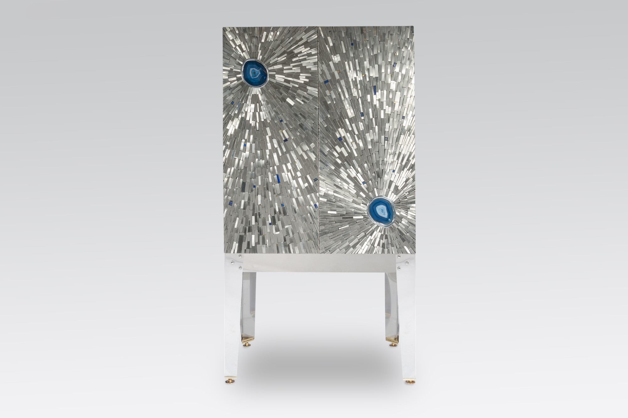 Created to measure by Stan Usel, this cabinet of stainless steel and brass is inserted with a magnificent agates stones highlighting a mosaic radiation. Different utility (bar,wardrobe,shelf) Each piece is topped with unique stones and is discretly designed to offer the ultimate connectivity for your needs. Exceptional craftsmanship with the art of tailor made furniture. This original and unique piece is signed by the artist and comes with a certificate of authenticity.All pieces can be custom-made to order. Proudly Belgian.
